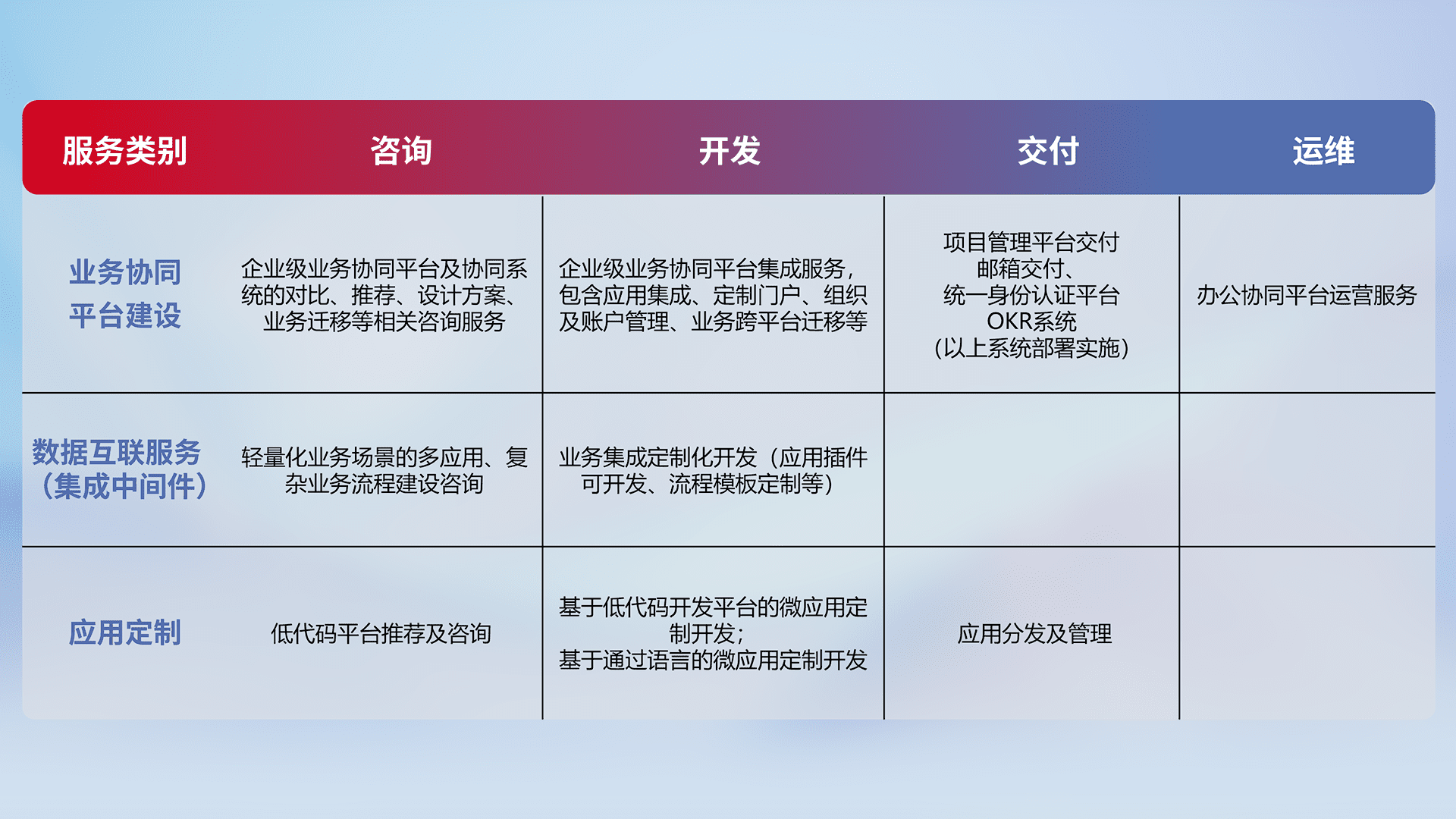 针对钉钉、、、、企微、、、、IDaas等平台级产品提供产品的规划、、方案、、交付、、、、定制化开发等服务,,,实现如统一协同办公、、、智能客户服务、、、、混合会议管理、、、、智能数据查询、、、等业务场景,,,实现数字化转型。。。