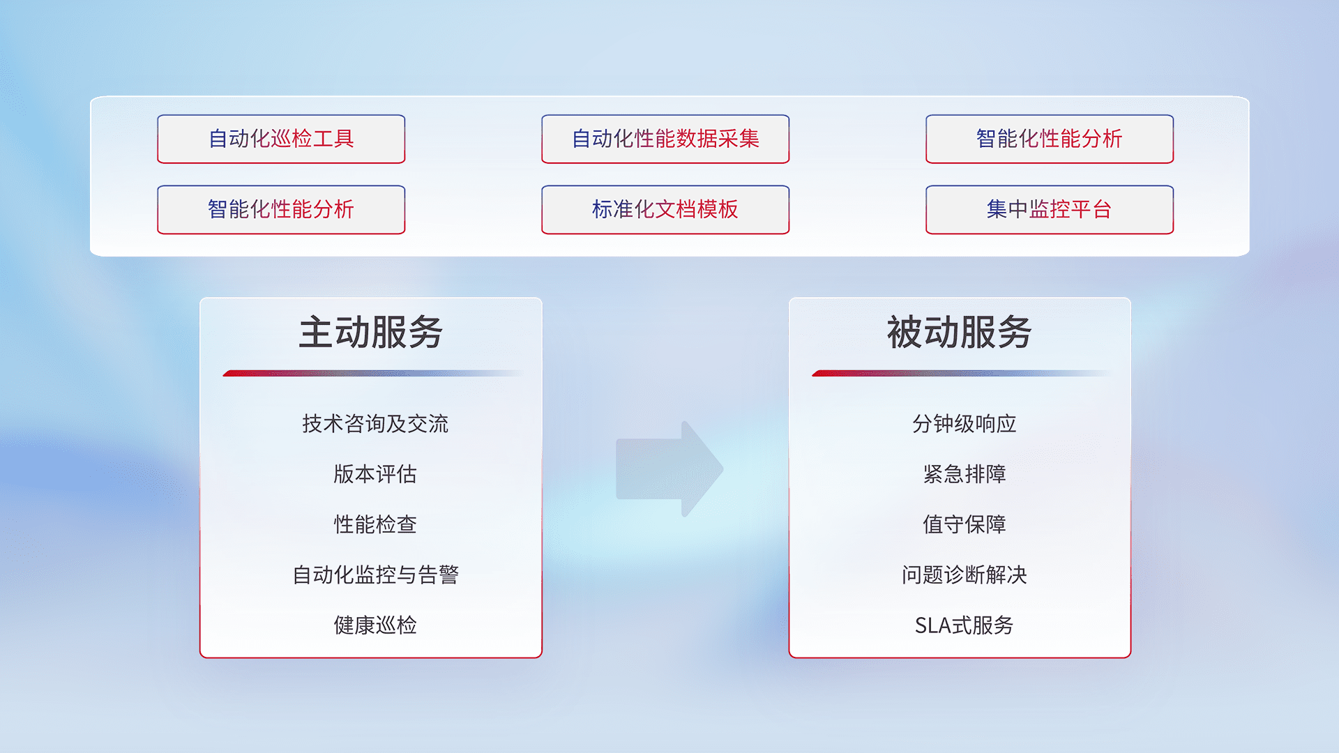 智能化工具和标准化文档,,保障服务质量,,提供主动服务(包含技术咨询、、版本评估、、性能检查、、自动化监控与告警、、、健康巡检)和被动服务包含(分钟级响应、、紧急排障、、、值守保障、、问题诊断解决、、、、SLA服务)。。。